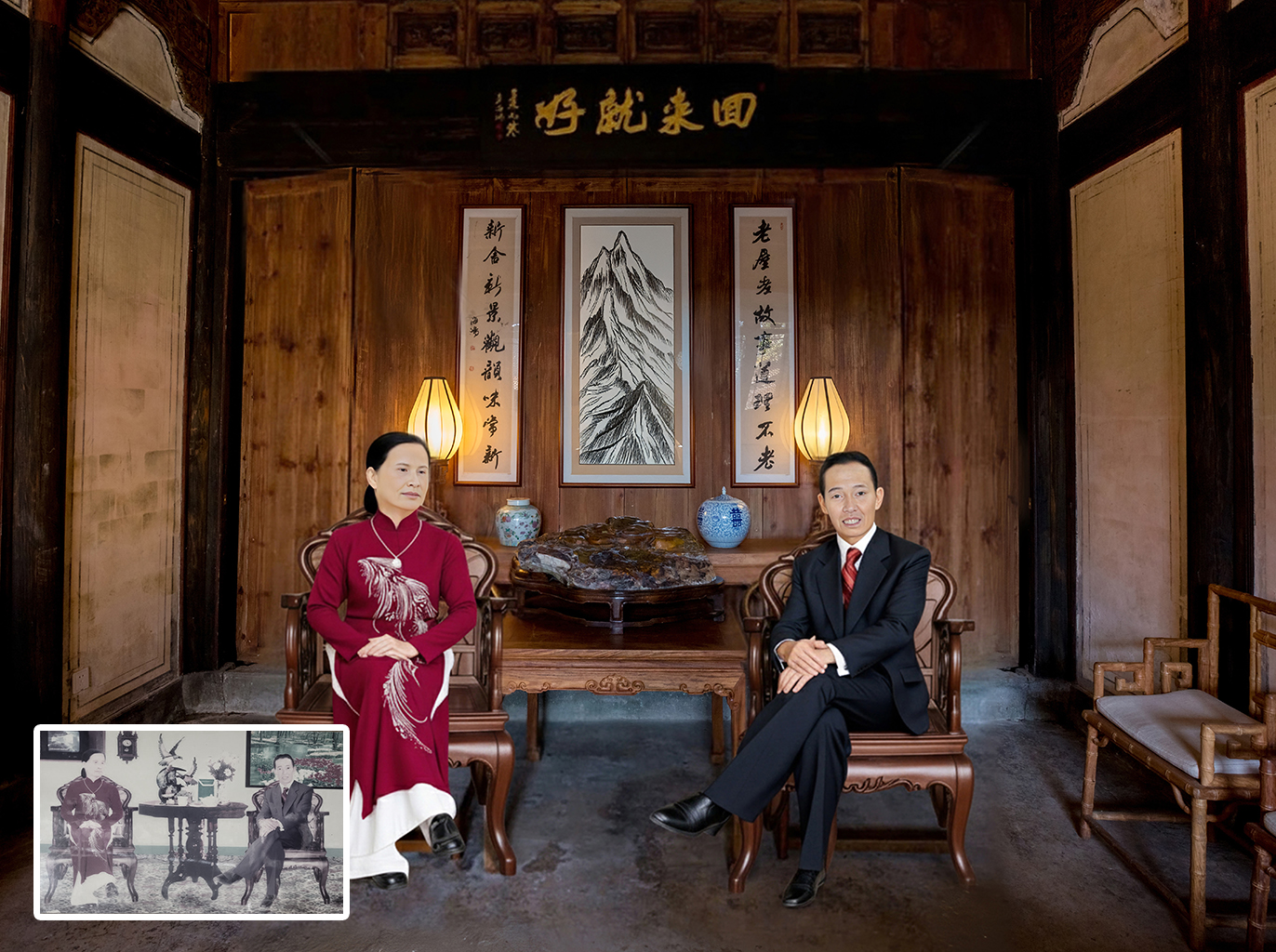 - Ghép ảnh và thay trang phục: Thay đổi trang phục (áo vest, áo dài, khăn đóng...), ghép phông nền trang trọng, hoặc ghép ảnh ông bà vào cùng một khung cảnh.